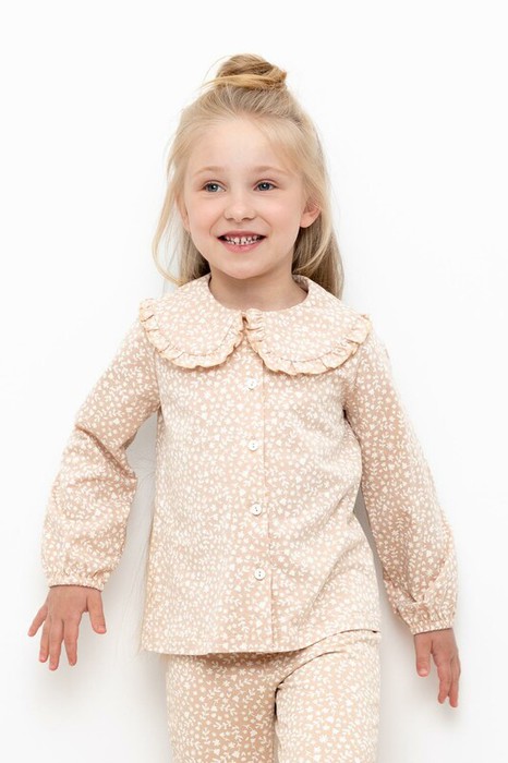Рубашка для девочки из гладкого трикотажного полотна. Застегивается на пуговицы по всей длине изделия. Украшена объемных воротником с рюшами. Оригинальная набивка выполнена из стойких текстильных гипоаллергенных красителей.