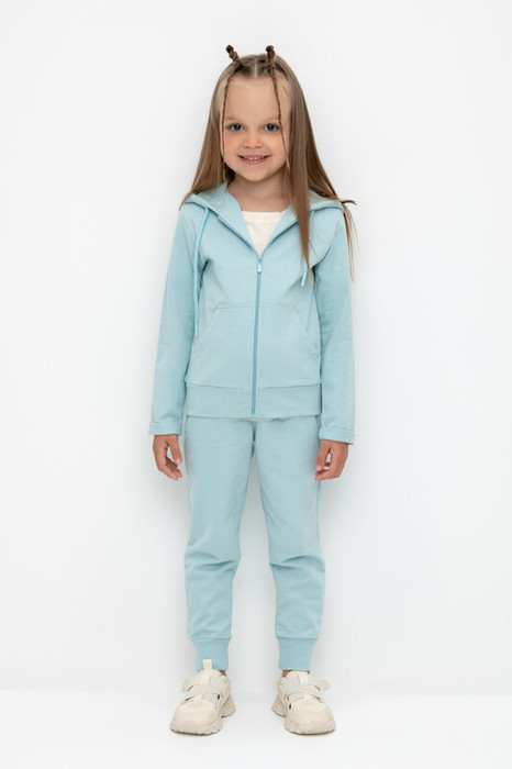 Трикотажные брюки для девочки из петельчатого футера. Эластичный пояс на резинке регулируется по ширине с помощью шнурка, по бокам два удобных кармана, внизу эластичные манжеты.