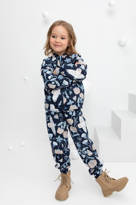 Трикотажные брюки для девочки из петельчатого футера. В составе 80% натурального хлопка и 20% полиэстера, при этом полиэстер ввязан внутрь по особой технологии и не соприкасается с кожей. Эластичный пояс на резинке, по бокам два удобных кармана, внизу эластичные манжеты. Оригинальная набивка выполнена из стойких текстильных красителей.