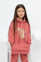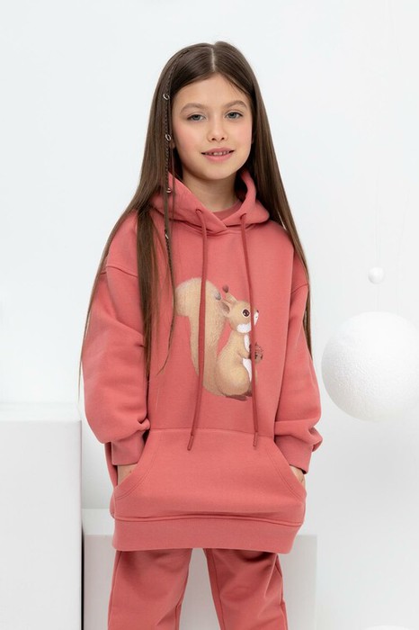 Толстовка удлиненная с капюшоном для девочки из футера с начесом. В составе 80% натурального хлопка и 20% полиэстера, при этом полиэстер ввязан внутрь по особой технологии и не соприкасается с кожей. Оригинальный принт выполнен из стойких текстильных красителей. Манжеты и пояс из эластичного трикотажа.