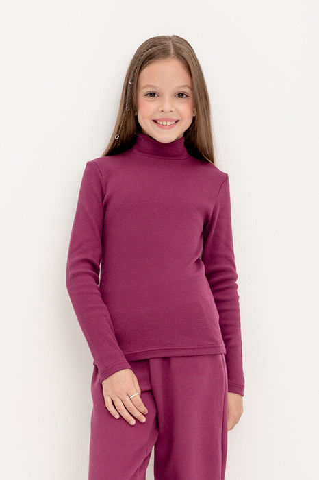 Базовая водолазка для девочки из эластичного кашкорсе, произведенного из натурального хлопка. Изделие имеет воротник с отворотом и длинные втачные рукава. Водолазка сохраняет цвет и форму после многократных стирок.
