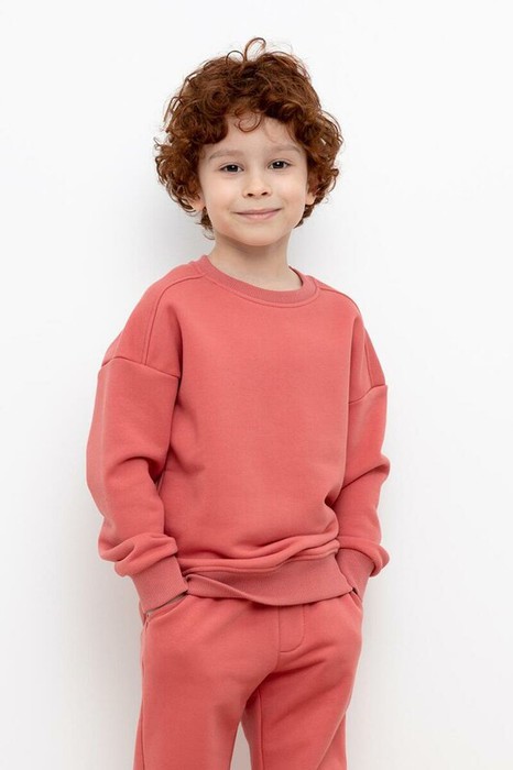 Джемпер для мальчика из петельчатого футера. В составе 80% натурального хлопка и 20% полиэстера, при этом полиэстер ввязан внутрь по особой технологии и не соприкасается с кожей. У изделия эластичная горловина, приспущенные объёмные рукава, эластичные манжеты и пояс. Джемпер сохраняет цвет и форму после многократных стирок.
