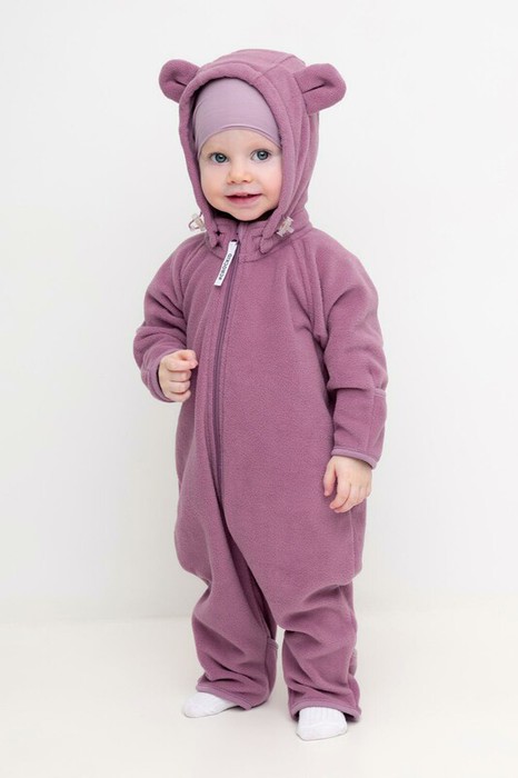 Флисовый комбинезон со съёмным капюшоном для девочки. У изделия высокий воротник и съёмный капюшон с декоративными ушками на кнопках. Застёгивается на удлинённую молнию. Предусмотрена защита шеи и подбородка. В размерах 40/62 - 48/74 на рукавах и штанинах есть удобные отвороты. Комбинезон сохраняет цвет и форму после многократных стирок.