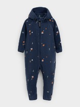 Флисовый комбинезон для мальчика со съёмным капюшоном. Капюшон регулируется по ширине с помощью эластичной утяжки со стопперами. Подклад выполнен из гладкого трикотажа супрем, произведённого из высококачественного натурального хлопка. Застёгивается на удлинённую молнию с мягкой защитой шеи и подбородка. В размерах 62, 68 и 74 на рукавах и ножках есть отвороты. Комбинезон сохраняет цвет и форму после многократных стирок.