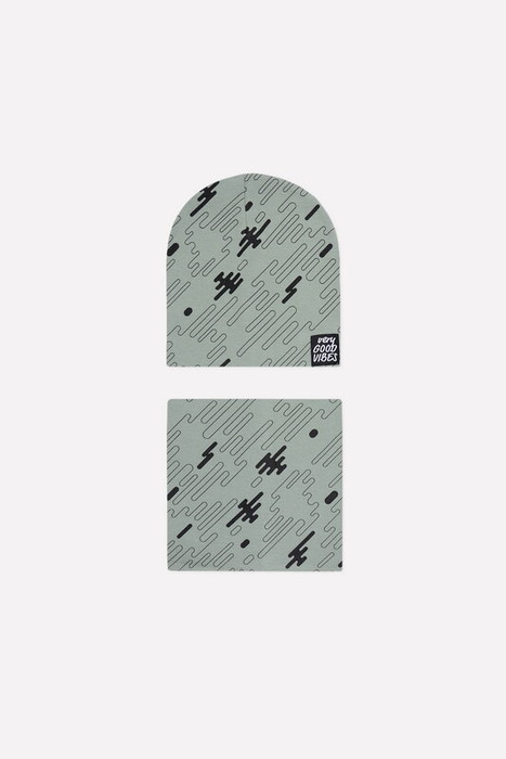 Комплект для мальчика - шапка и снуд из набивного трикотажа рибана с эластаном. Шапка с удлинённой скругленной макушкой, украшена жаккардовой нашивкой. Снуд сплошной.