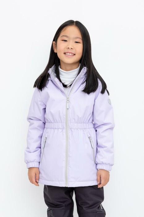 Демисезонная куртка для девочки с утеплителем SEE®: 120 г/м2. Выполнена из мембранной ткани с дополнительной тефлоновой обработкой. Данный вид обработки предохраняет изделие от загрязнения и лучше отводит влагу. Подклад из 100% полиэстера. У изделия предусмотрена защита подбородка. Несъемный капюшон регулируется с помощью эластичного шнура со стопперами. Низ рукавов и пояс  изделия имеют эластичную резинку для лучшего прилегания. Во всех изделиях верхнего ассортимента для безопасности ребенка предусмотрены светоотражающие элементы.