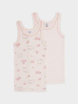 Трикотажные майки в комплекте 2 шт на тонких бретелях из однотонного супрема с эластаном, горловина спинки и проймы обработаны кантом, по горловине полочки декоративная эластичная тесьма и атласный бантик. Сохраняют цвет и форму после многократных стирок. Все трикотажные полотна производятся в соответсвии с нормами Швейцарского сертификата ЭкоТекс.
