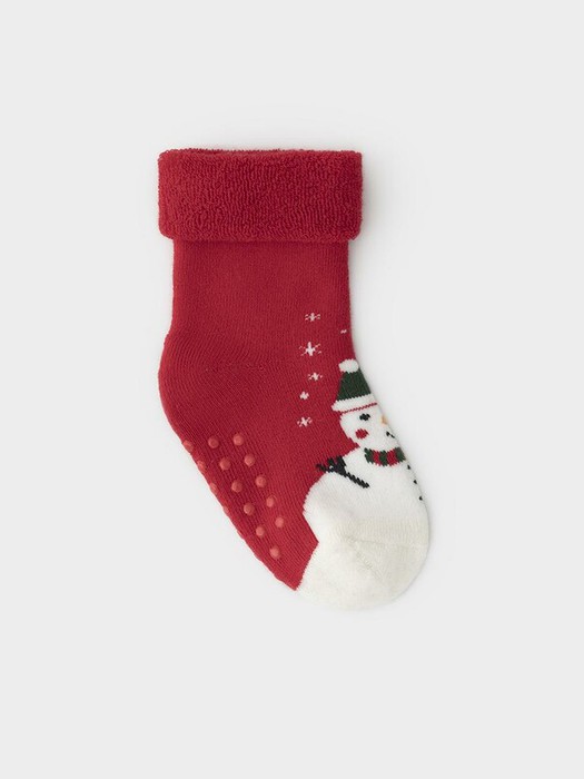 Тёплые махровые носки с формованной пяткой и отворотом по краю. На подошве резиновые стопперы. Украшены рисунком. Отлично подойдут для создания праздничных образов или как дополнение к подарку на Новый год и Рождество. Изделие сохраняет форму и стойкий цвет после многочисленных стирок.