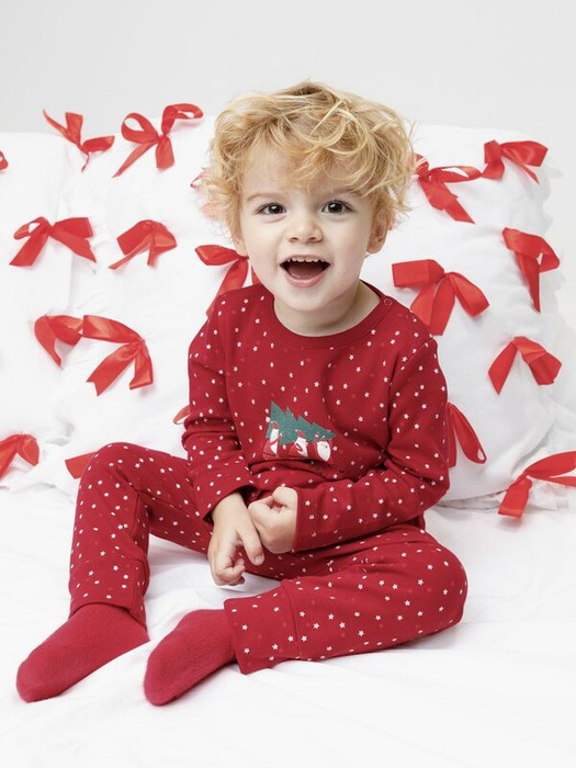 Трикотажная пижама из натурального хлопка. Джемпер с длинными втачными рукавами и брюки с эластичной резинкой в поясе. Отлично подойдёт для создания праздничных образов или в качестве подарка малышу на Новый год и Рождество. Джемпер застёгивается на кнопки. По низу брюк мягкие манжеты. Оригинальная набивка и принт выполнены из стойких текстильных гипоаллергенных красителей. Изделие сохраняет цвет и форму после многократных стирок. Все трикотажные полотна производятся в соответствии с нормами швейцарского сертификата ЭкоТекс.