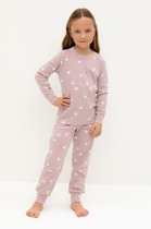 Трикотажная пижама в рубчик из натурального хлопка. Джемпер с длинными втачными рукавами и лосины с эластичной резинкой в поясе. Оригинальная набивка выполнена из стойких текстильных гипоаллергенных красителей. Изделие сохраняет цвет и форму после многократных стирок. Все трикотажные полотна производятся в соответсвии с нормами швейцарского сертификата ЭкоТекс.