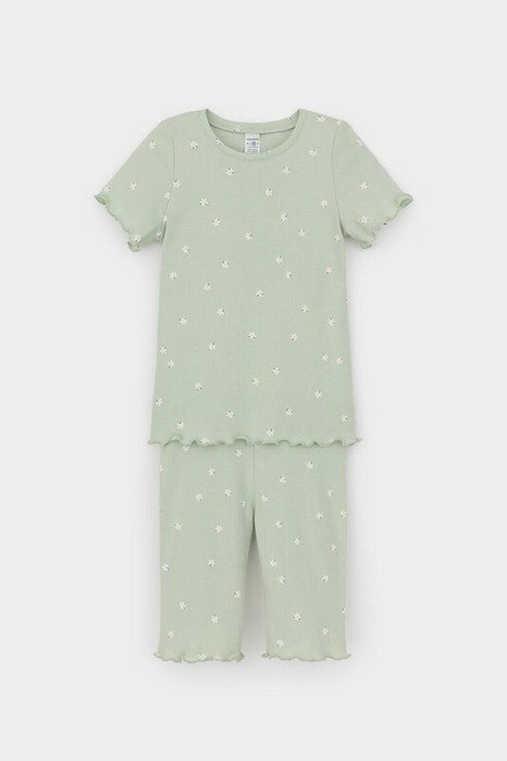Трикотажная пижама в рубчик из натурального хлопка. Футболка с короткими втачными рукавами и шорты с эластичной резинкой в поясе. Оригинальная набивка выполнена из стойких текстильных гипоаллергенных красителей. Изделие сохраняет цвет и форму после многократных стирок. Все трикотажные полотна производятся в соответсвии с нормами швейцарского сертификата ЭкоТекс.
