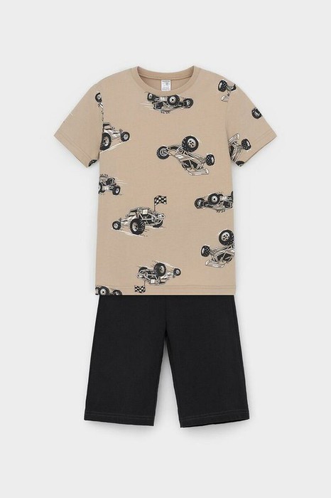 Пижама для мальчика из натурального хлопка. Футболка с короткими втачными рукавами и шорты с эластичной резинкой в поясе. Оригинальная набивка выполнена из стойких текстильных гипоаллергенных красителей. Изделие сохраняет цвет и форму после многократных стирок. Все трикотажные полотна производятся в соответствии с нормами швейцарского сертификата ЭкоТекс.
