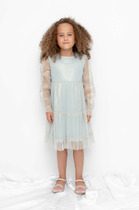 Нарядное платье для девочки из высококачественного трикотажа супрем с лёгким слоем из сетки. Короткие рукава из сетки собраны на резинку. Для удобства одевания платье застёгивается на пуговицу на спинке. Платье сохраняет форму и стойкий цвет после многочисленных стирок и идеально подходит для праздников и фотосессий.
