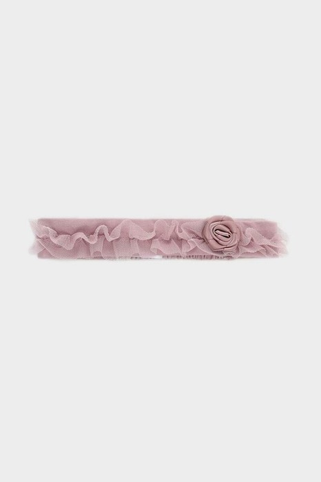 Повязка на голову для девочки из высокачественного хлопкового трикотажа супрем. В области затылка эластичная мягкая резинка. Украшена присборенной рюшей из сетки и декоративной розочкой. Все трикотажные полотна производятся в соответствии с нормами швейцарского сертификата ЭкоТекс.