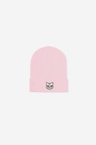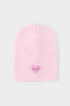 Тёплая вязаная шапка в оттенке "брусника" для девочки. На отвороте прикреплена нашивка с надписью.