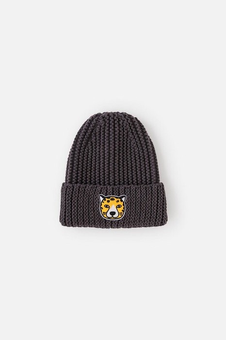 Модная детская шапка с широким отворотом. Связана из полушерстяной пряжи в оттенке "графит". Украшена нашивкой с изображением мордочки леопарда.
