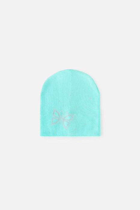 Шапка из акриловой пряжи бирюзового оттенка с внутренним отворотом. Украшена аппликацией из страз в форме бабочки.