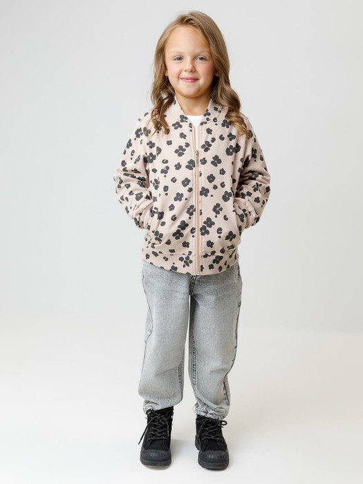 Мягкий бомбер на молнии для девочки. Изготовлен из высококачественного футера с начёсом. Воротник, манжеты и пояс выполнены из эластичного полотна. Оригинальный рисунок выполнен из стойких текстильных красителей. Бомбер сохраняет форму и стойкий цвет после многочисленных стирок. Все трикотажные полотна производятся в соответствии с нормами швейцарского сертификата ЭкоТекс.