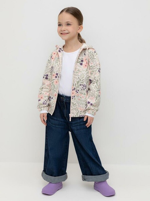 Трикотажная толстовка на молнии с капюшоном для девочки из мягкого набивного футера петли. Модель с боковыми карманами и манжетами на резинке.