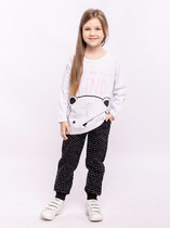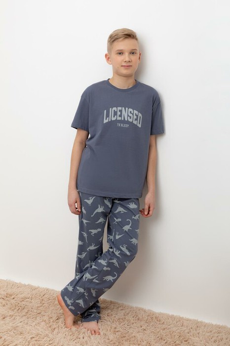 Трикотажный пижамный комплект из натурального хлопка. У футболки короткие рукава. Брюки с удобным поясом на резинке и утягивающим плетеным шнуром. Оригинальная набивка и принт выполнены из стойких, гипоаллергенных текстильных красителей. Все трикотажные полотна производятся в соответствии с нормами Швейцарского сертификата ЭкоТекс.