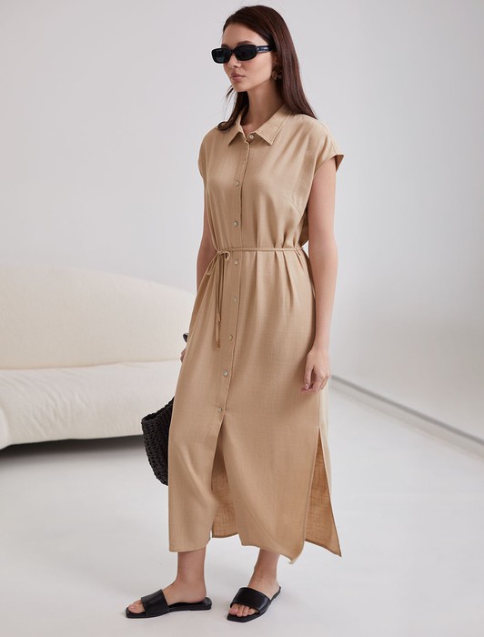Длинное платье-рубашка с поясом и разрезами изо льна с вискозой