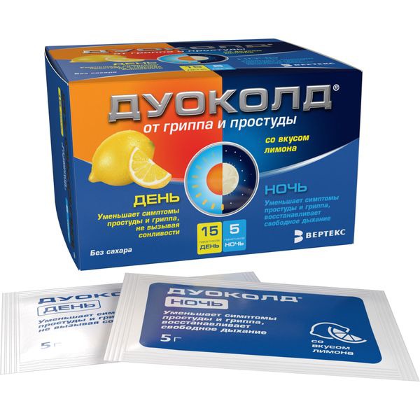 Розничная цена от 730. Дуоколд порошок для приготовления раствора для приема внутрь вкус клюквы - это комбинированный лекарственный препарат, действие которого обусловлено входящими в его состав компонентами, оказывает жаропонижающее, противовоспалительное, обезболивающее, противоаллергическое, ангиопротекторное и сосудосуживающее действия. Устраняет симптомы «простуды». Сужает сосуды носа, устраняет отек слизистой оболочки носа. Применяется для симптоматического лечения инфекционно-воспалительных заболеваний: ОРВИ (острая респираторная вирусная инфекция), в том числе грипп и «простуда», сопровождающиеся повышением температуры тела, ознобом, головной болью, болями в суставах и мышцах, насморком, заложенностью носа, чиханием и болями в горле и пазухах носа. Содержимое пакетика растворить в одном стакане (200 мл) горячей, но не кипящей, воды. Употребить сразу после растворения. Перед употреблением раствор размешать. В упаковке 15 пакетиков порошка для приготовления раствора для приема внутрь «День» и 5 пакетиков порошка для приготовления раствора для приема внутрь «Ночь».