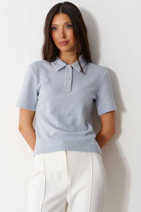 Джемпер-поло прямого кроя. Выполнен из фактурного трикотажа голубого цвета. Воротник отложной. Застёжка пуговички на планке. Рукав втачной, короткий. Длина спинки 54 см. Длина рукава от линии втачивания 21 см