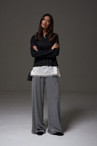 Джемпер прямого кроя. Выполнен из мягкого трикотажного полотна. Отложной воротник. В области горловины застежка на планке на петли пуговички. Рукав втачной. Длина рукава от края горловины 73 см. Длина спинки 56 см