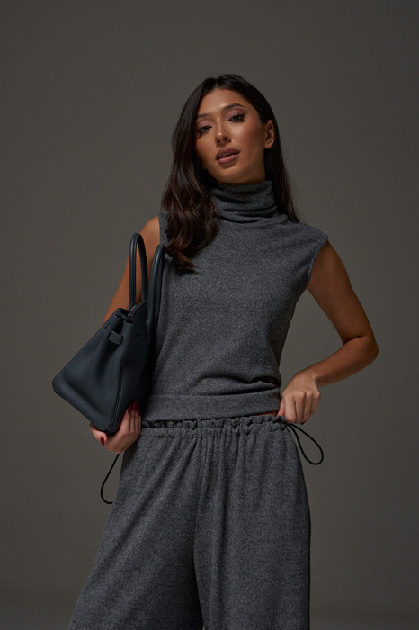 Джемпер без рукавов прилегающего силуэта, выполнен из мягкого ворсистого трикотажного полотна серого цвета. Характеристики: Горловина-стойка, в естественную складку. Длина спинки от края горловины 54 см.