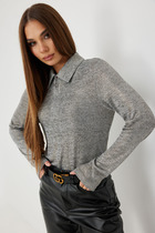 Джемпер свободного кроя. Выполнен из плотного трикотажного полотна шоколадного цвета. Воротник отложной. Застёжка центральная - акцентные пуговицы. Рукав спущенный, с манжетой. Низ изделия на резинке, регулируется. Длина рукава от линии втачивания 59 см. Длина спинки 70 см