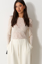 Джемпер прилегающего силуэта. Выполнен из кружевного полотна цвета шампанского. Характеристика: горловина обработана косой бейкой. Рукав одношовный втачной. Низ рукава и низ изделия обработаны в подгибку с открытым срезом. Длина рукава 68 см, длина джемпера по спинке 58 см.
