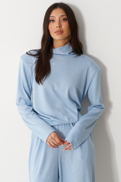 Джемпер укороченный прямого свободного кроя. Выполнен из мягкого трикотажа голубого цвета. Горловина-стойка, в естественную складку. Есть подплечники (съёмные). Длина рукава от линии втачивания 62 см. Длина спинки 54 см