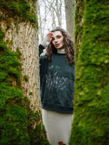 Джемпер из тонкого вискозного трикотажа, свободного силуэта, "оверсайз", с круглой горловиной с отрезной бейкой. Линия плеча спущена. Рукав 3/4, зауженный. На переде авторский принт.