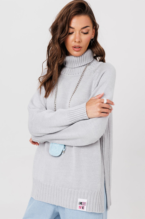 жемпер удлинённый трикотажный вязанный с длинным рукавом-реглан. По переу нашивка «LOVE». Внизу по боковым швам разрезы. Горловина - стойка с отворотам, по краю которого нашивка «BUTER».