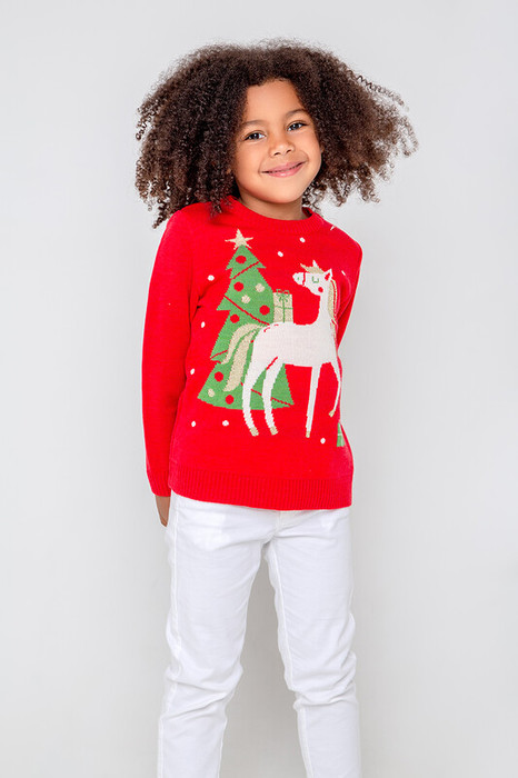 Красный джемпер с круглой горловиной. На груди - вывязанный рисунок с изображением лошадки и новогодней ёлки. На локтях - золотые сердечки. Горловина, манжеты и пояс связаны ластиком.