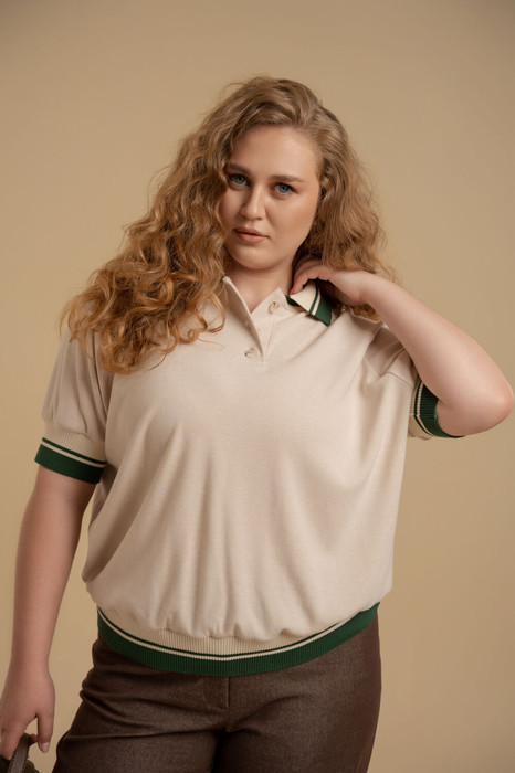 Джемпер женский свободного покроя из трикотажного полотна. Вырез горловины оформлен воротником - поло. Рукава - реглан. Низа изделия посажены на декоративные довязы.