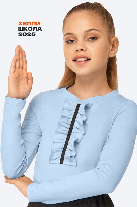 Голубой лонгслив не сковывает движений и дарит комфорт во время активных будней. Мягкая горловина не сдавливает шею, а длинные рукава нежно облегают руки и согревают в прохладную погоду. Аккуратные рюши делают образ милым и кокетливым.