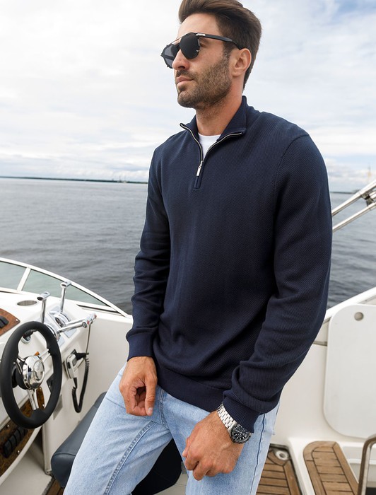 Состав: 55%Хлопок 45%ПАН (акрил) Параметры модели на первом фото: Рост 190, бюст 108, талия 87, бедра 104Для изготовления светло-синего джемпера с воротом, застегивающимся на молнию, использовали мягкий трикотаж, связанный из премиального хлопка с добавлением акрила. Двуслойное жаккардовым плетение, вязка с фактурой типа «пике», благодаря чему джемпер имеет среднюю плотность, эластичноть и, при этом, формоустойчивость. Греет за счет иск.шерсти (ПАН) в составе, а премиальный хлопок помогает защитить изделие от скатывания. Такой состав гигроскопичен, греет, но абсолютно не колет