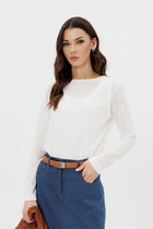 Праздничная элегантная блузка полуприлегающего силуэта, выглядит эффектно, прекрасно подойдет для  мероприятий. Горловина аккуратной округлой формы. Рукав втачной, свободный с фантазийным решение, длина 7/8. Декоративным элементом является съемная дизайнерская брошь. Средний шов спинки вверху переходит в застежку на 6 навесных петель, пуговиц.  В боковых швах предусмотрены разрезы.