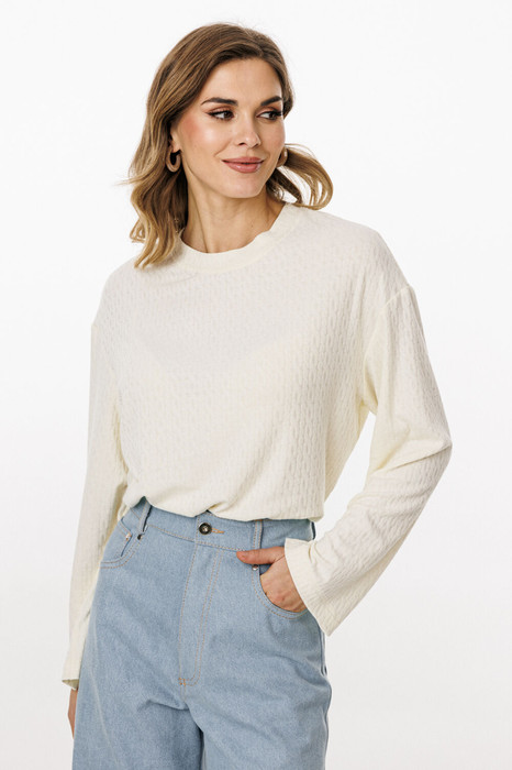 Джемпер выполнен из трикотажного полотна с рисунком. Джемпер прямого силуэта, длиной до линии бедра. Перед и спинка цельные. Горловина округлой формы, обработана широкой бейкой. Плечевой шов удлинен. Рукав одношовный, прямой.