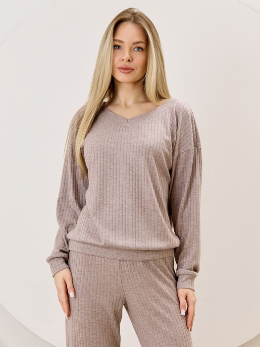 Джемпер женский из гладкокрашенного трикотажного фактурного полотна в «рубчик» с добавлением ангоры, классического покроя, с расширенной V-образной горловиной, обработанной втачной планкой, длинными втачными рукавами. Низ изделия обработан притачным поясом, рукава с манжетами.