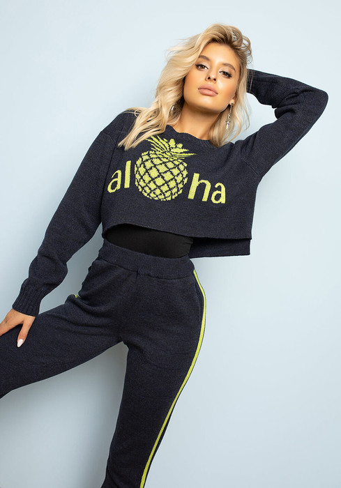 Кроп-топ оверсайз джемпер с ярким жаккардом прямого силуэта длиной выше линии талии. Длина спинки на 5-6 см больше чем длина переда. Рукав рубашечного покроя стандартной длины втачаный в щелевидную пройму. Вырез горловины - лодочка.