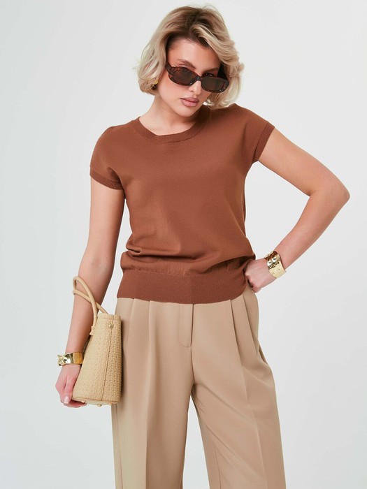Тонкий, но плотный, легкий джемпер из вискозной пряжи длиной выше линии берда (при росте 166-170 см и стандартных обхатах по груди). Силуэт изделия полуприлегающий. Линия плеча опущена, обрамлена бейкой резинкой. Вырез горловины лодочко округлый. В данном изделии следует обращать внимание на общую ширину плеч. Если пречи не стандартные широкие, то лучше выбирать по ширине плеч размер.