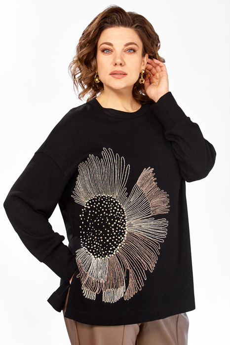 Джемпер женский, свободного кроя, изготовлен из трикотажного полотна. Горловина круглой формы. На полочке — вышивка. Спинка цельнокроенная. Рукава спущеные, с манжетам по низу. В боковых швах разрезы.