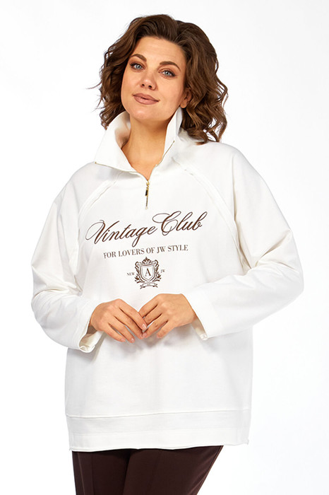 Джемпер  женский свободного силуэта изготовлен из хлопкового полотна, с воротником стойка на молнии. Перед и спинка в области бедер с декоративным подрезом. Рукава — реглан. Низ изделия, низ рукавов и швы втачивания  рукавов выполнены необработанным срезом. Джемпер дополнен дизайнерской печатью.