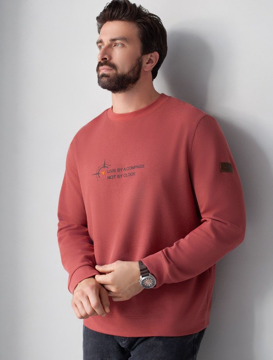 Состав: 80%Хлопок 20%ПЭ Плотность: 170 Г/м2Легкий и невероятно комфортный джемпер кирпичного цвета создан для повседневного образа. Мягкий фактурный эластичный трикотаж приятно ощущается на теле, не сковывает движения и отлично подходит для носки в любое время года. Полуприлегающий крой обеспечивает свободу и удобство, позволяя выглядеть стильно и чувствовать себя уверенно каждый день. Круглый ворот украшен декоративной нашивкой в виде перевернутого треугольника, добавляющей оригинальности.. Манжеты на рукавах и по низу аккуратно оформлены, что придает завершенность внешнему виду и способствует сохранению формы джемпера после длительной носки и многочисленных стирок. Принт в виде небольшой надписи добавляет яркости, подчеркивая индивидуальность каждого мужчины. Перевод надписи: Live by а compass not by clock - Жить по компасу, а не по часам.