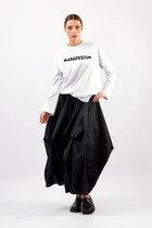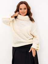 Джемпер изготовлен из вязаного трикотажа. Линия плеча спущена. Рукав длинный поддерживается патой на пуговицу. Воротник-хомут.