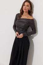Ассиметричный джемпер  прилегающего силуэта из трикотажного полотна. Верхняя часть джемпера  с ассиметричным вырезом. Рукав одношовный втачной.  По переду нагрудная вытачка и рельеф со сборкой.