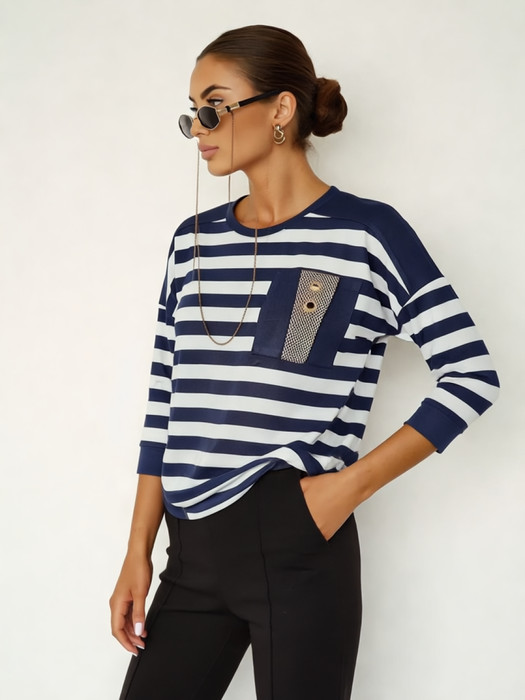 Блузка женская повседневная выполнена из мягкого польского трикотажа с добавлением вискозы, что делает ее не только стильной, но и комфортной в носке. Прямой силуэт блузки подчеркнет достоинства вашей фигуры. На груди блузка украшена потрясающим "сеткой-карманом"с люверсами, что придает ей особый шарм. Круглый вырез горловины делает модель универсальной и подходящей для любого случая. Спина в полоску, с декоративными пуговицами на планке по середине спинки, что создает элегантный и захватывающий вид.