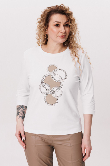 Джемпер женский из трикотажной ткани. По переду расположен принт со стразами. Рукав втачной, одношовный 3/4. Вырез горловины круглый, оформлен притачной бейкой.